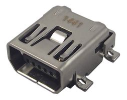Part Status: ActivePackaging: TrayConnector Type: USB - mini ABNumber of Contacts: 5Gender: ReceptacleSpecifications: USB 2.0Mounting Type: Surface Mount, Right AngleMounting Feature: HorizontalTermination: SolderFeatures: Board Guide, Solder RetentionOperating Temperature: -40°C ~ 85°CNumber of Ports: 1Current Rating (Amps): 1AVoltage - Rated: 30VACMating Cycles: 5000